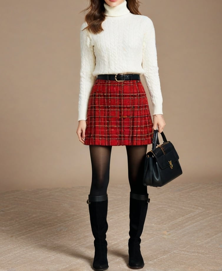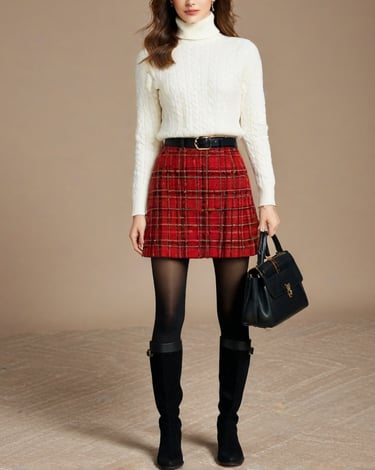 This sophisticated yet cozy look is perfect for the holiday season. A soft white turtleneck sweater is paired with a red plaid tweed skirt, creating a timeless and festive combination. The soft, knitted white turtleneck effortlessly balances the festive, rich red plaid tweed skirt. While the cozy black tights and knee-high boots keep you snug and the classic black leather belt perfectly balances the outfit. This ensemble perfect if you want to look put together, preppy, timeless and chic.