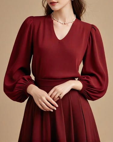 Step into a holiday fairy tale with a delicate princess blouse full of timeless femininity and charm. The ethereal, billowy sleeves gives this look the royal elegant look, while the darker colors such as burgundy makes it suitable for the winter time. Paired with a matching long thick or woolen skirt and the wintery princess look is complete yet not over the top. Finished with dainty jewelry, a silver or gold hair piece and heeled boots, this outfit is perfect for those looking to add a dash of classic glamour, fairytale, and femininity to their Christmas celebrations.