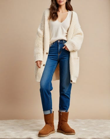 If you wanna be the most comfortable, laid back and cute person in the room this is the outfit for you. Go for a chunky knit oversized cardigan in warm soft colors like a creamy beige or rich brown which is perfect for layering over a simple fitted top or a long-sleeve shirt in a solid basic color. Paired with high-waisted jeans and comfy cute uggs, this relaxed yet stylish outfit is perfect for holiday lounging, Christmas shopping, or family gatherings. You really can't go wrong with this outfit, the cardigan will make you look more dressed up rather than just wearing a basic top and jeans and you will be comfy and cute all season long.
