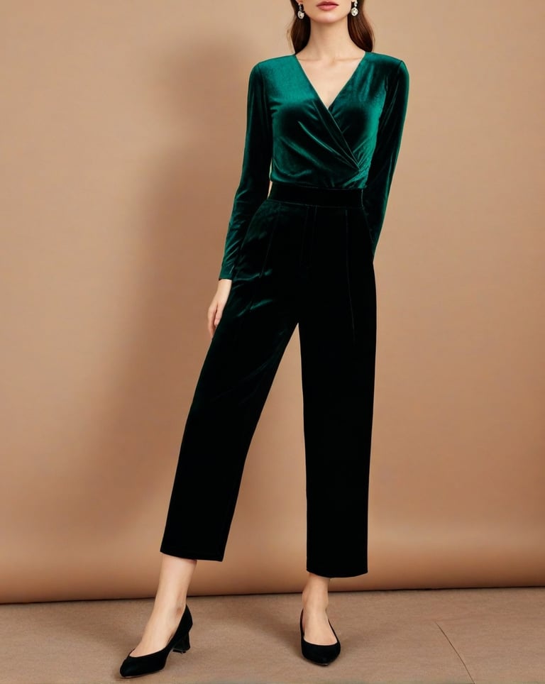 Luxe and festive, this velvet top and black pants combination is perfect for a stylish holiday evening. With a rich velvet top worn in deep jewel tones, such as emerald green or deep burgundy, with a slight sheen and a flattering fit, paired with sleek black pants that taper at the ankle, this outfit strikes the perfect balance between sleek sophistication and holiday comfort. Add a pair of simple black flats and delicate jewelry to complete this elegant yet easy-to-wear look, ideal for holiday dinners or festive nights out. I would recommend wearing delicate gold jewelry with this look as it will perfectly compliment the deep jewel tones of the velvet.
