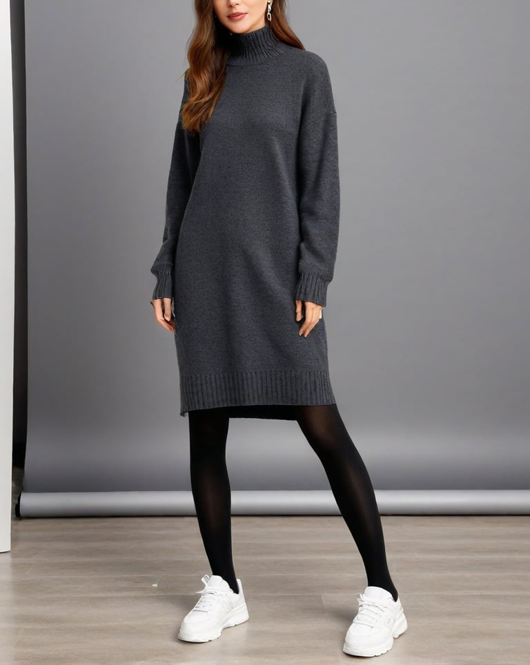Wrap yourself in the ultimate cozy outfit this holiday season with a sweater dress that offers both warmth and charm. This effortlessly stylish piece hugs your figure in all the right places, with its ribbed texture and high neckline offering protection from the chill while still keeping things festive. Go for rich winter hues like berry red or forest green, or for a laid back charcoal grey, it's perfect for those chilly Christmas dinners. Pair with thick tights, ankle boots (or sneakers), and a plush scarf for an outfit that's truly classic, extremely comfortable and will hug your curves in all the right places (while leaving room for some extra stuffing and dessert). Simple, quick, elegant, and warm.