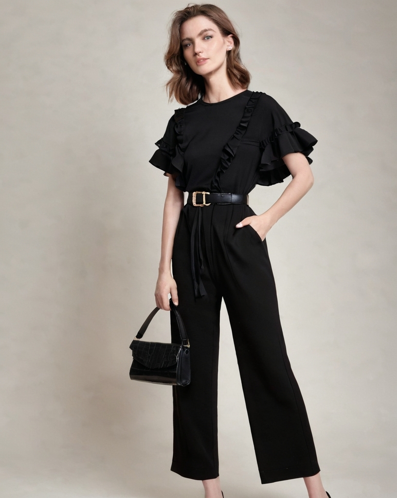 For a sleek and polished spring look, this all-black outfit featuring a short-sleeve ruffle shirt, a black belt with gold detailing, and black pants is the perfect balance of edgy and sophisticated. The ruffle shirt adds a feminine touch with its playful texture, making it ideal for the warmer spring days while still offering a bit of coverage. The black belt with gold accents creates a chic focal point that elevates the entire ensemble. The black pants keep things streamlined and modern, ensuring the outfit remains sophisticated yet comfortable. Whether you're heading to a dinner date, a day at the office, or a night out with friends, this effortlessly stylish look makes a bold statement while keeping things spring-ready and classic.