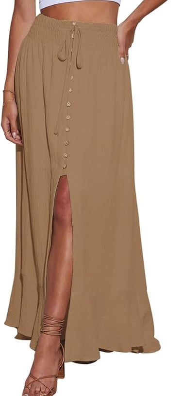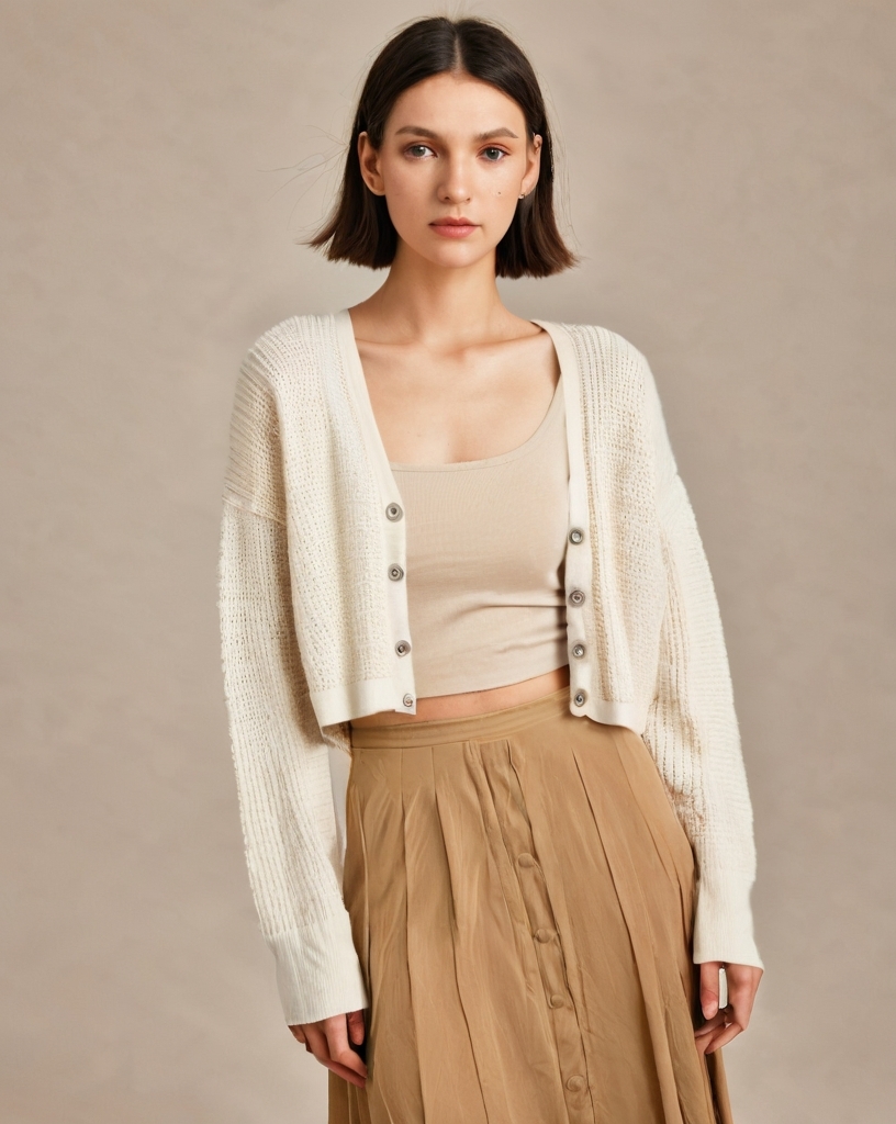 For a soft, effortless spring look, this light beige cropped tank paired with a matching button-down beige maxi skirt is a must-try combination. The cropped tank offers a breezy, flattering fit, while the button details on the skirt add a touch of sophistication and vintage charm. The matching beige tones create a seamless, monochromatic look that’s as chic as it is versatile. Layering with a cropped white knit cardigan brings just the right amount of warmth for cooler days or evenings, while adding texture to the outfit. Perfect for a springtime stroll or a casual day out, this ensemble is all about relaxed elegance with a hint of cozy comfort.