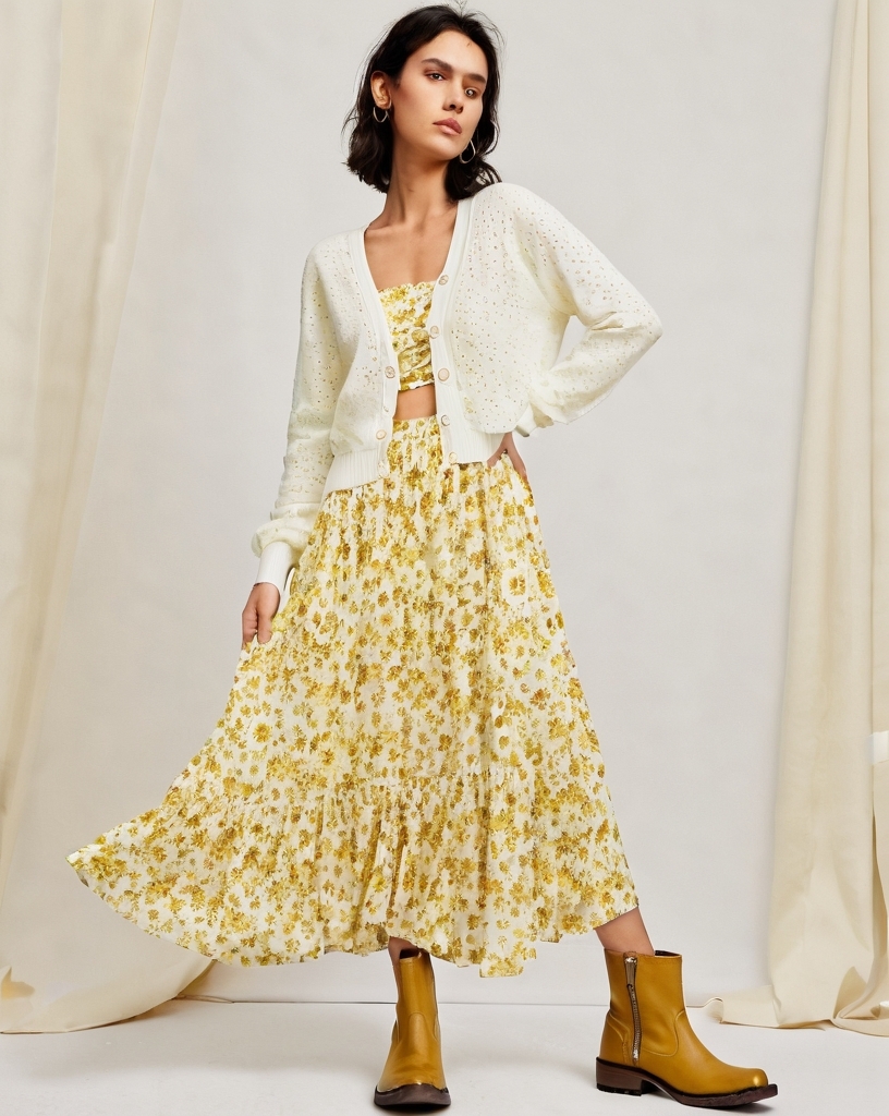 Spring is the perfect time to embrace fresh, breezy styles, and this floral yellow two-piece tank and maxi skirt set is the ultimate way to do it! The cheerful yellow floral pattern adds a pop of color, while the tank top keeps things light and airy. Paired with a flowy, floor-length maxi skirt, this look is effortlessly feminine and perfect for sunny days. For warmer spring days or as the season starts to transition toward summer, the lightweight fabric keeps you comfortable without overheating. To top it off, a cropped white eyelet cardigan adds a touch of delicate texture and just the right amount of warmth for cooler evenings. Add matching yellow boots to keep you warm in that transitional weather. Whether you're strolling through a farmers' market or meeting friends for brunch, this outfit radiates effortless spring vibes!