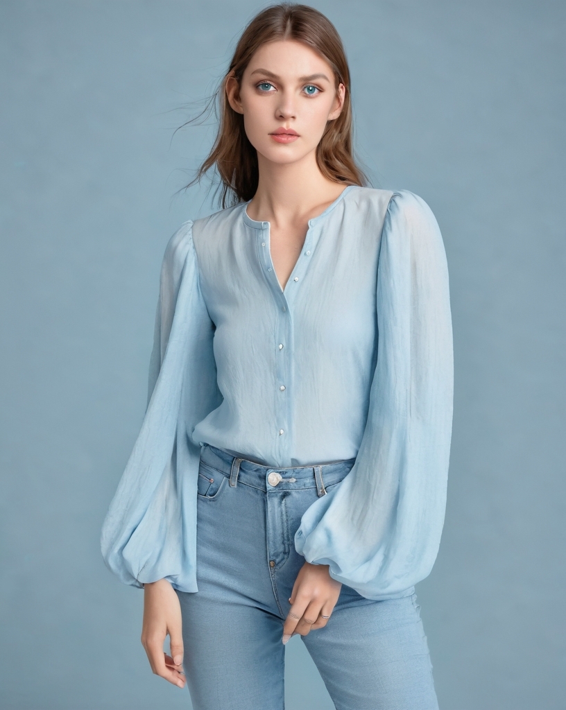 Embrace effortless spring elegance with this light baby blue long sleeve princess sleeve blouse paired with light wash blue jeans. The soft, pastel blue hue of the blouse evokes a sense of calm and freshness, while the voluminous princess sleeves add a touch of romance and sophistication. Tucked into or casually left over the waistband, the blouse perfectly complements the laid-back yet stylish vibe of the light wash blue jeans, offering a timeless, casual look that’s perfect for spring outings. Whether you’re brunching with friends or enjoying a sunny afternoon in the park, this outfit is a refreshing mix of comfort and style that never goes out of season.
