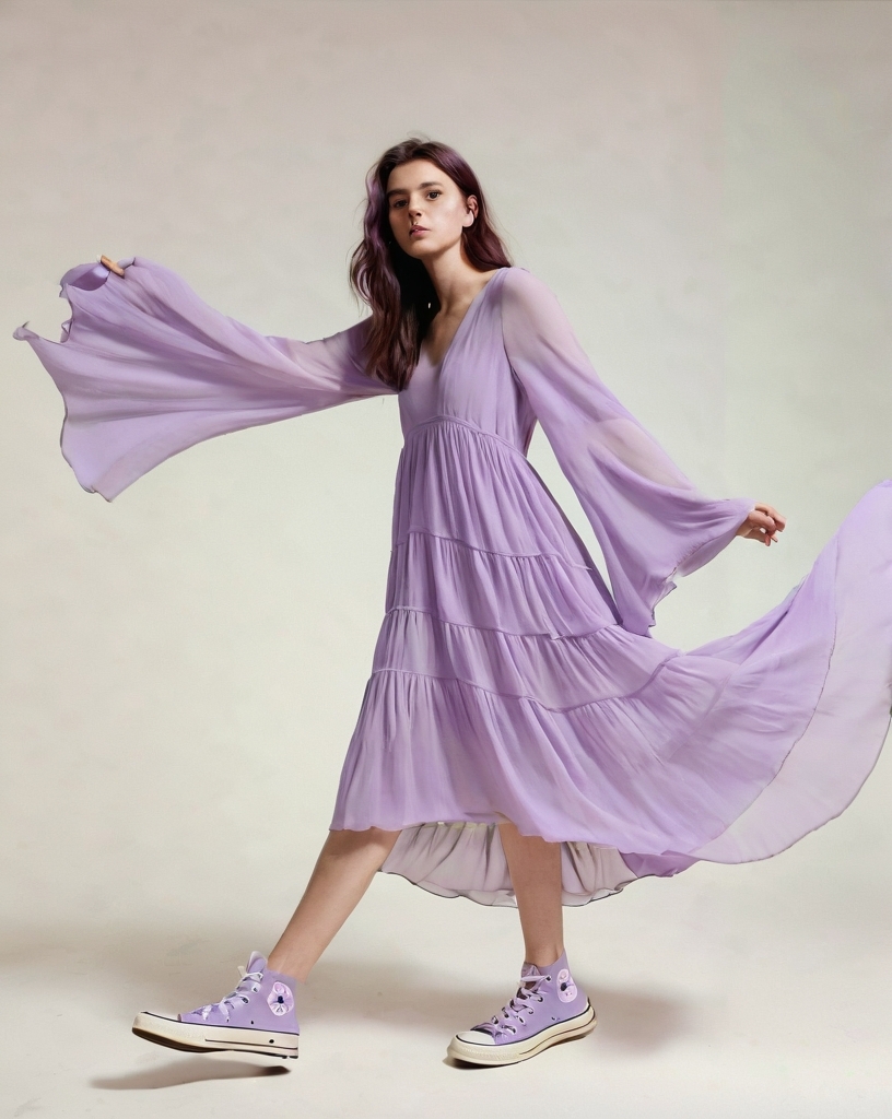 For a fun and dreamy spring look, this flowy long-sleeve lavender dress paired with lavender Converse high-tops is the perfect mix of elegance and casual comfort. The dress drapes effortlessly, with its long, flowy sleeves adding a whimsical, romantic touch, while the soft lavender hue keeps the vibe fresh and feminine. Pairing it with lavender Converse high-tops gives the outfit a laid-back, youthful twist, making it perfect for everything from a spring picnic to a day out with friends. This combination blends the best of both worlds—dreamy and laid-back—with a touch of playful personality, making it a go-to choice for those easygoing spring days.