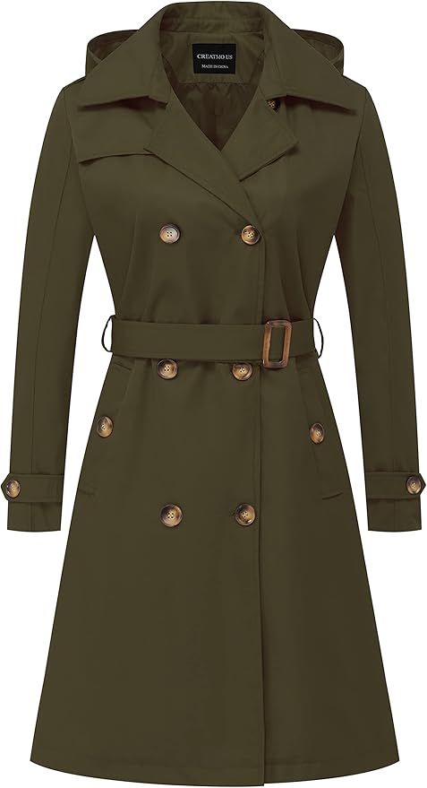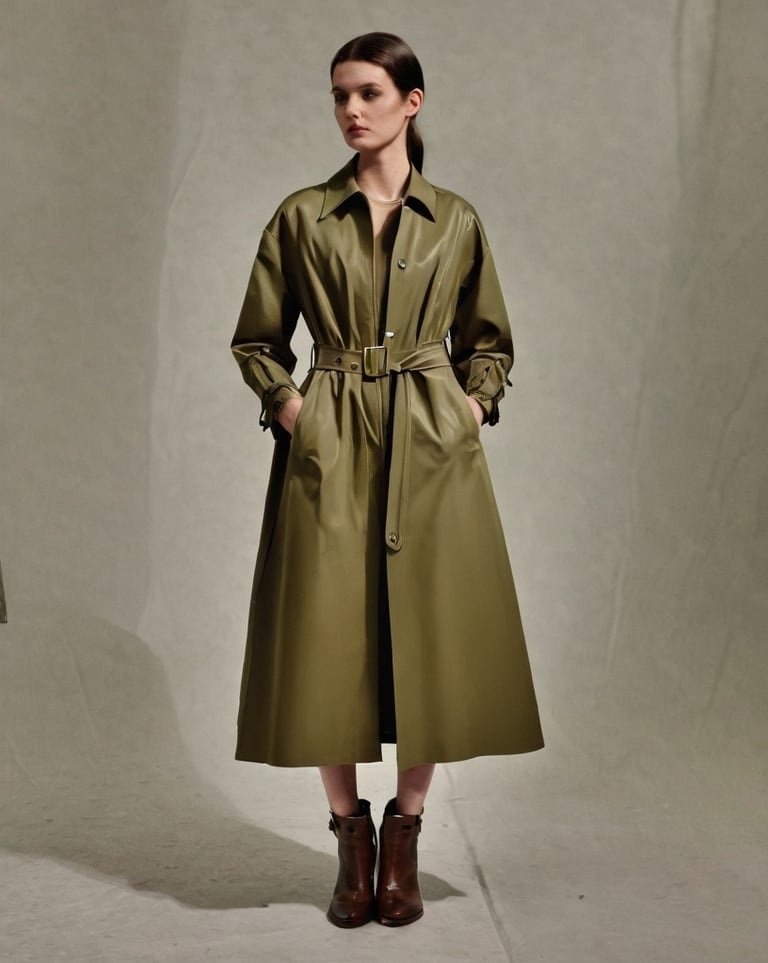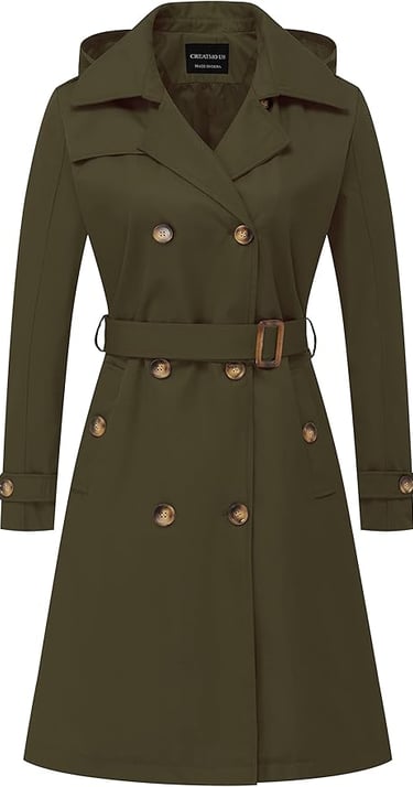 When the weather calls for something a bit more layered, this long olive green trench or raincoat is the perfect choice to stay stylish and dry. With its sleek, military-inspired color and classic tie belt waist, it creates a flattering silhouette while keeping you cozy and protected from spring showers. The earthy green hue pairs beautifully with neutral tones, and the brown ankle boots complete the look with a touch of rustic charm. Whether you're running errands on a rainy day or heading out for a casual walk through the park, this versatile coat offers both functionality and fashion, making it a go-to for end-of-spring days when the weather can be a bit unpredictable.