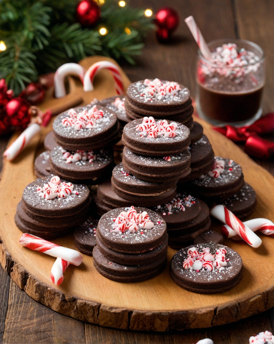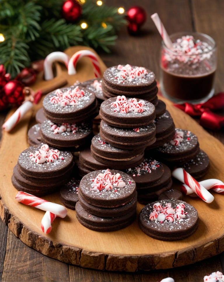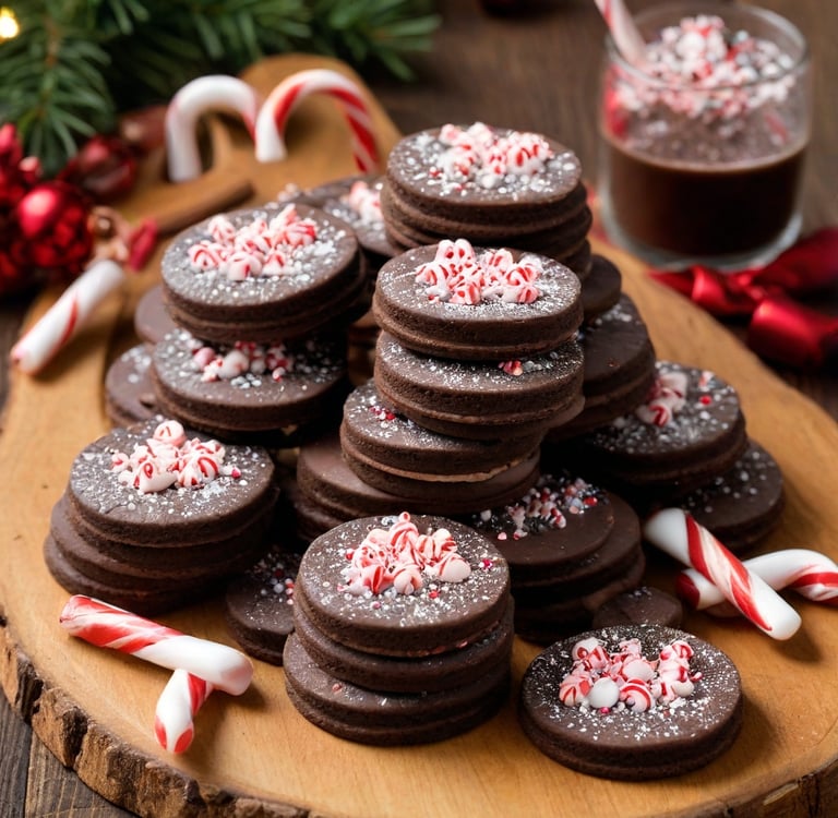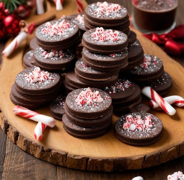 Mix flour, cocoa powder, and salt. Separately, beat butter and sugar until fluffy, then stir in dry ingredients and peppermint extract. Shape dough, cut into flat rounds or use a cookie cutter, and bake at 325°F for 12-15 minutes. Top with chocolate chips and crushed candy canes (optional). Cool completely.