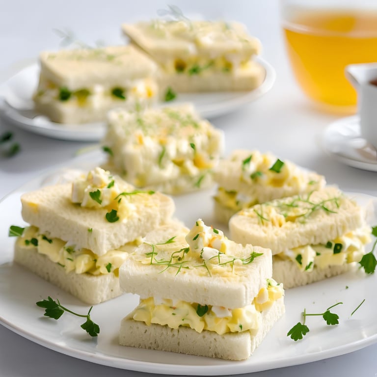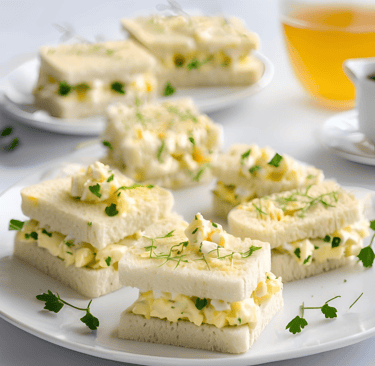 Mix chopped eggs with mayonnaise, Dijon mustard, cinnamon, nutmeg, and ginger. Spread the egg mixture on the bread, close the sandwich, and cut into bite-sized rectangles.