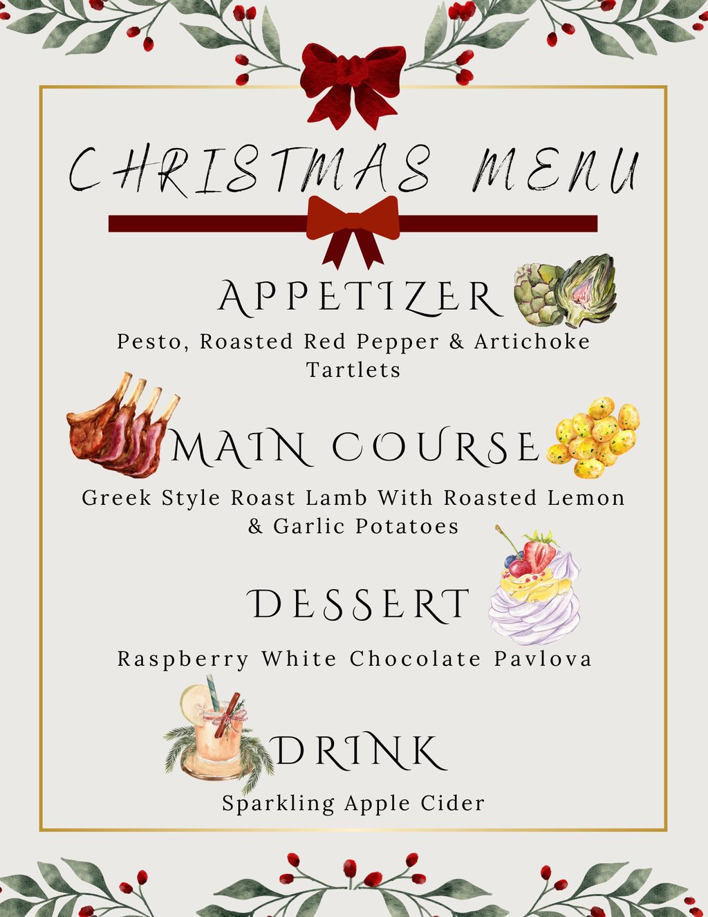 This Christmas, let your table tell a story of warmth, celebration, and culinary delight. From succulent Greek-style roast lamb, lemon garlic potatoes, to decadent white chocolate pavlova, each dish is crafted to fill your home with festive joy. With sparkling apple cider and savory roast pepper artichoke tartlet appetizers, this menu promises to create unforgettable moments, turning your holiday gathering into a feast for the senses. Let the flavors of the season bring your loved ones closer as you share in the magic of Christmas together or even alone.