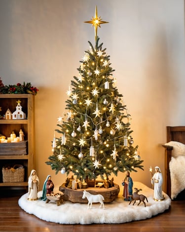 Create a meaningful, peaceful Christmas display with a soft and warm Nativity scene Christmas tree that centers on the true spirit of Christmas. This theme embraces soft, earthy tones and comforting textures, bringing a sense of calm and reverence to your holiday decor. Picture a tree adorned with warm golds and gentle browns, accented by delicate figurines of the Holy Family, angels, the star of Bethlehem and the wise men, all surrounded by soft white lights that create a serene, glowing ambiance.