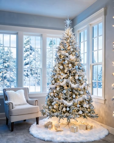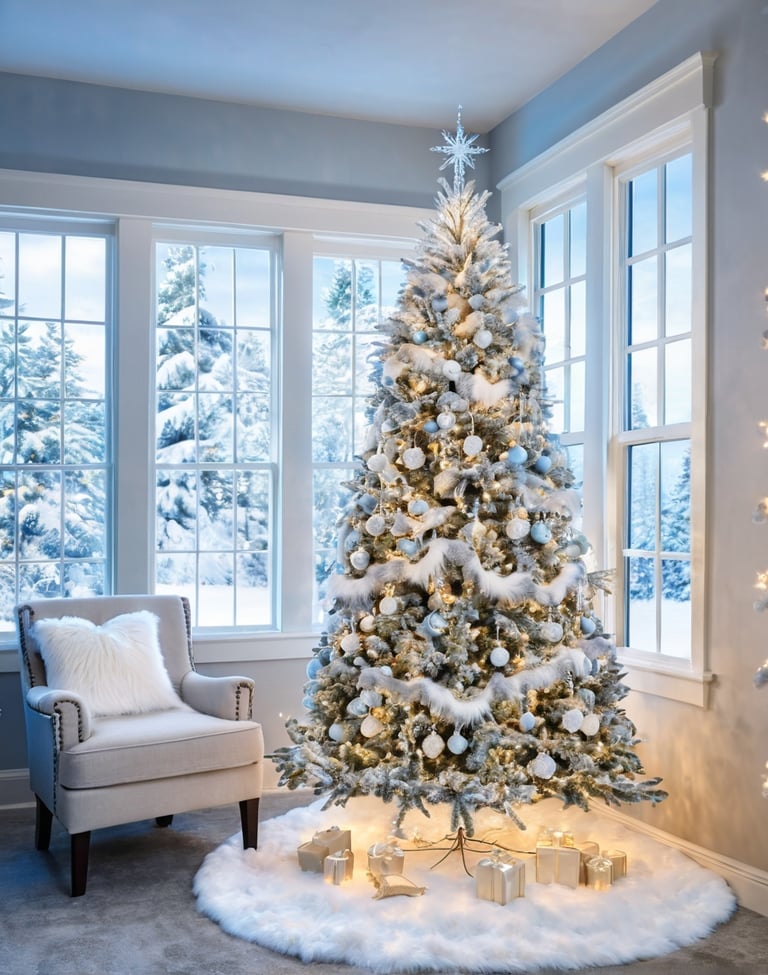 Bring the serene beauty of a snowy landscape into your home with a winter wonderland Christmas tree. This theme is all about creating a peaceful, frosty atmosphere with shades of soft white, light blue, and subtle silver accents. Imagine a tree dusted with faux snow, shimmering icicles, and delicate snowflakes, combined with the cool elegance of light blue ornaments and soft metallics. It’s a look that captures the magic of winter—crisp, clean, and full of enchantment.