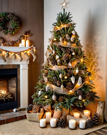 The Woodland Forest tree brings the outdoors in, with its natural textures and woodsy feel. To enhance the woodland vibes, incorporate burlap ribbons, twine garlands, and woven wicker baskets, adding depth and warmth to your decor. Soft white lights illuminate the tree, highlighting the natural beauty of pinecones, acorns, and twigs as ornaments. This theme is perfect for creating a cozy, nature-inspired holiday ambiance that feels grounded and peaceful, as if your home is nestled deep in an evergreen forest.