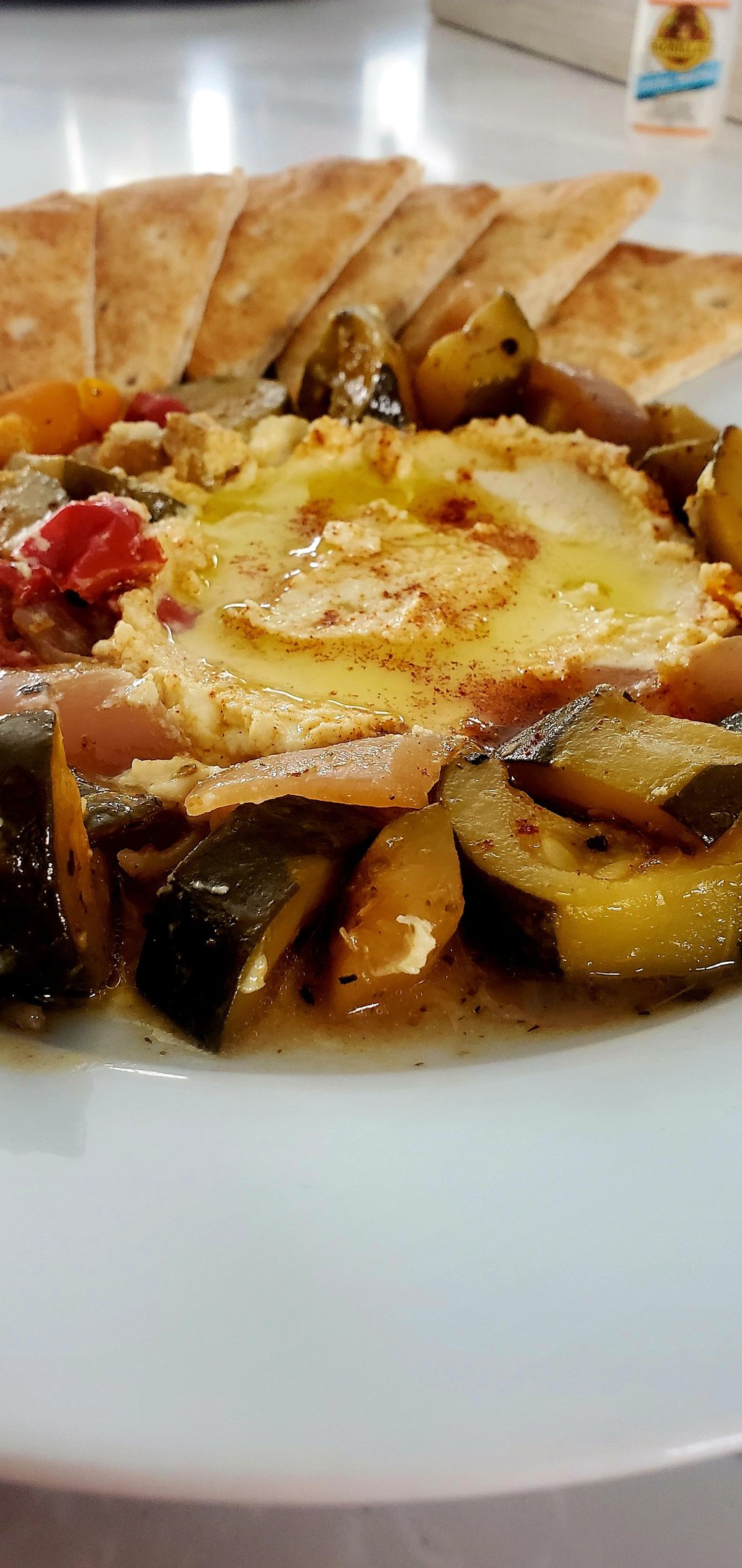 7. Place the warm pita wedges around the hummus and vegetables. Serve immediately, and enjoy this vibrant and healthy Mediterranean-inspired dish. You can serve this as a lunch dish, snack, or appetizer for dinner.