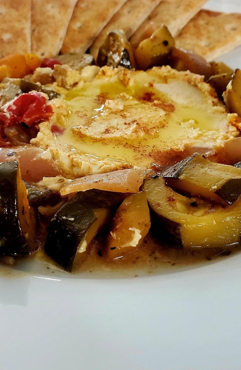 This Roasted Veggie Hummus Plate is a vibrant and flavorful dish that brings together the best of Mediterranean cuisine in one simple yet satisfying meal. Featuring a colorful medley of roasted vegetables, perfectly caramelized and seasoned, this dish pairs beautifully with a creamy scoop of hummus. The addition of warm, crispy pita bread slices makes for the ideal vessel to scoop up the goodness, creating a perfect balance of textures and flavors with every bite. Whether you're enjoying it as a light lunch, a snack, or a shareable appetizer, this dish is sure to please.