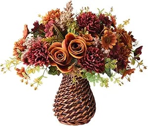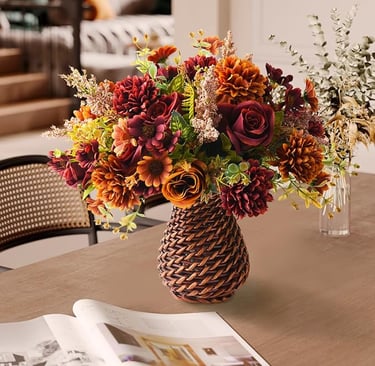 Bring a touch of fall nature inside your home this fall with this stunning fall faux flower bouquet! Capturing the vibrant hues of autumn, such as maroon, burnt orange, and mustard yellow all in a rustic rattan vase. Perfect for your dining table or cozy corners, enjoy the beauty of autumn all year round with this delightful decor piece!