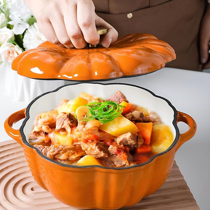 This Pumpkin shaped cast iron pot is perfect for savory slow-cooked stews or fragrant seasonal soups. Whether its dinner, lunch, or dessert it'll make everything taste a bit more cozy and delicious. This pumpkin-shaped pot is a must-have for your pot collection!