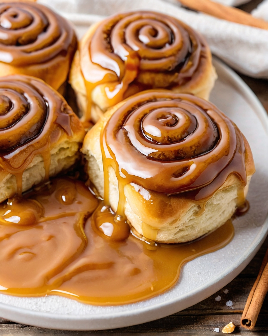 Soft and pillowy cinnamon rolls drizzled with a golden salted caramel coconut cream glaze. Each bite is filled with the creaminess and smoothness of coconut cream mixed with the richness of the caramel sauce and the deep indulgence of cinnamon and nutmeg with a pinch of salt.